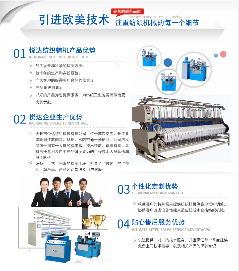 公司是主要生產(chǎn)紡織平車安裝工具、紡部輔件及配件綜合性企業(yè)。已有二十多年的生產(chǎn)歷史,在激烈的市場競爭中始終保持優(yōu)良的質(zhì)量、優(yōu)化的價格、齊全的品種優(yōu)勢。產(chǎn)品暢銷全國各地,深受新老客戶的好評。